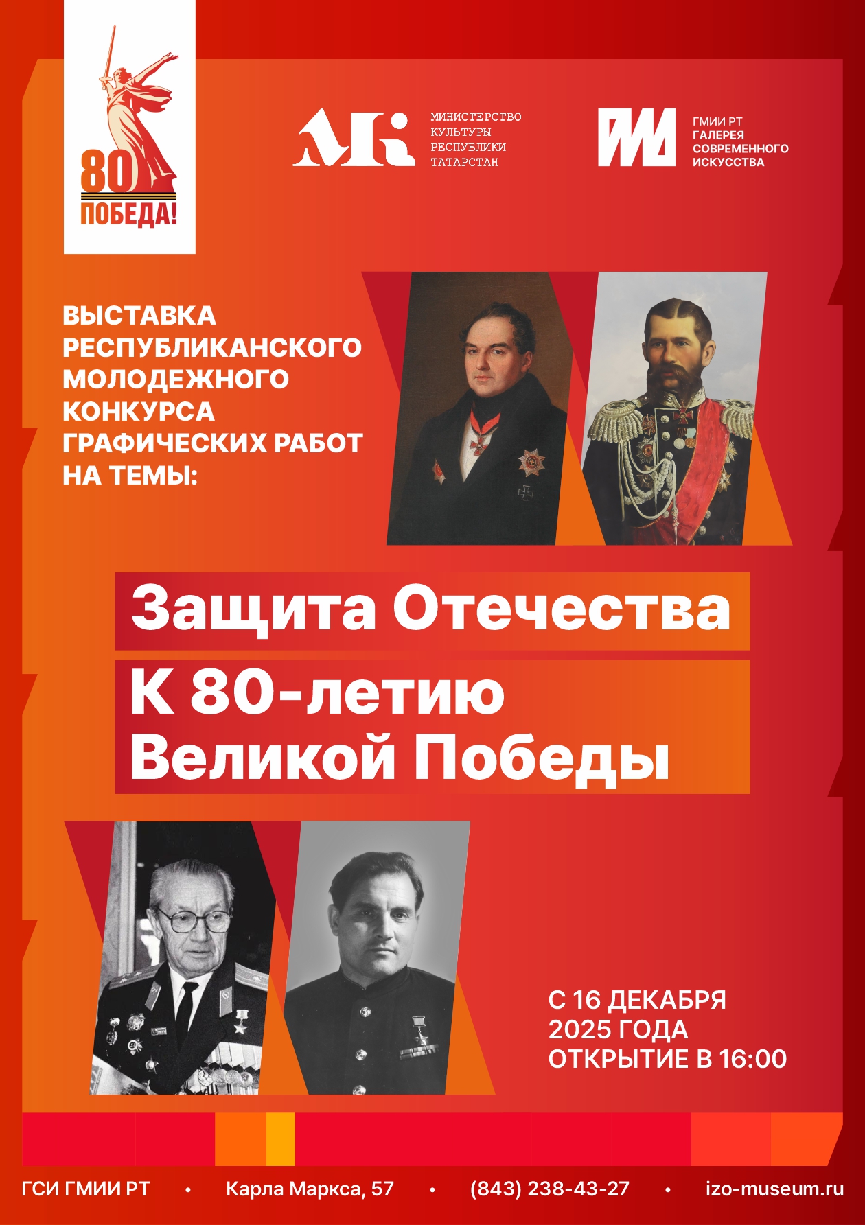 16 декабря в 16:00 в Галерее современного искусства ГМИИ РТ состоится открытие выставки по итогам проведения первого Ежегодного республиканского конкурса графических работ. Конкурс организован Министерством культуры РТ и проводится ГМИИ РТ. Более 70 участников из учебных заведений Татарстана предоставили работы, посвященные основной теме конкурса: «Защита Отечества». На выставке будут представлены лучшие конкурсные работы, победителям будут вручены дипломы, подарки и денежные премии.