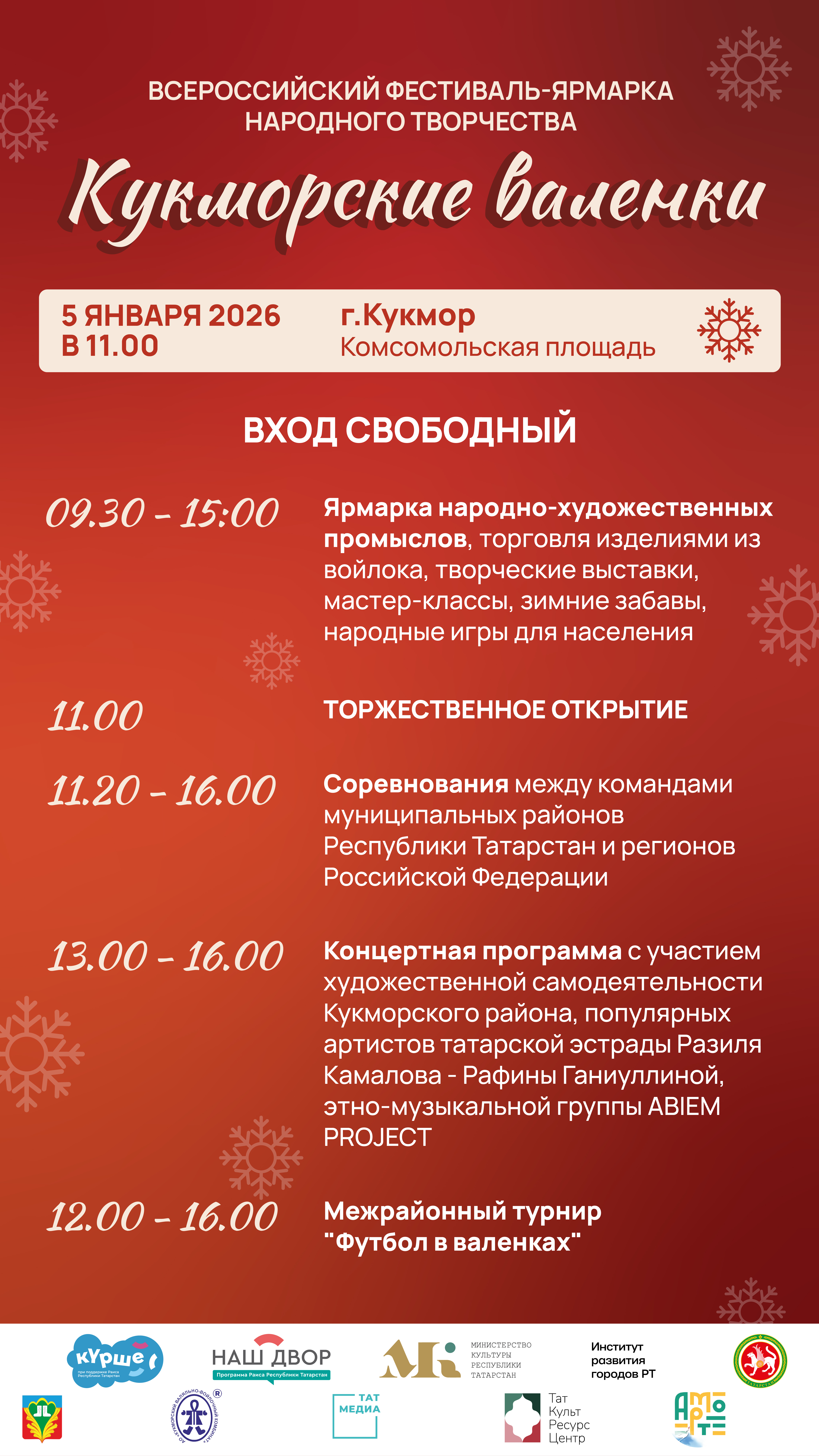 5 января 2026 года в городе Кукмор состоится XI Всероссийский фестиваль-ярмарка народного творчества «Кукморские валенки». Этот яркий зимний праздник, ставший одним из главных культурных брендов Кукморского района, пройдет при поддержке зимнего фестиваля «Күрше», Администрации Кукморского района и АО «Кукморский валяльно-войлочный комбинат».