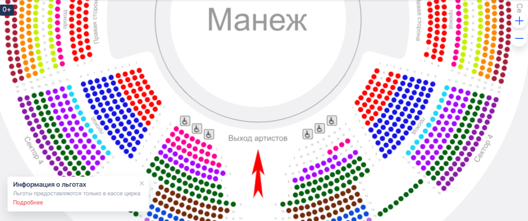 Всего организованно шесть таких мест в пятом секторе – три с правой стороны и три с левой. Чтобы зрителю в инвалидной коляске занять место в специально отведенном пространстве, нужно купить любой доступный билет на представление.