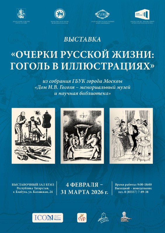 4 февраля 2026 года 15.00 часов в Выставочном зале Елабужского государственного музея-заповедника состоится открытие выставки «Очерки русской жизни: Гоголь в иллюстрациях» из собрания ГБУК города Москвы «Дом Н.В. Гоголя – мемориальный музей и научная библиотека».