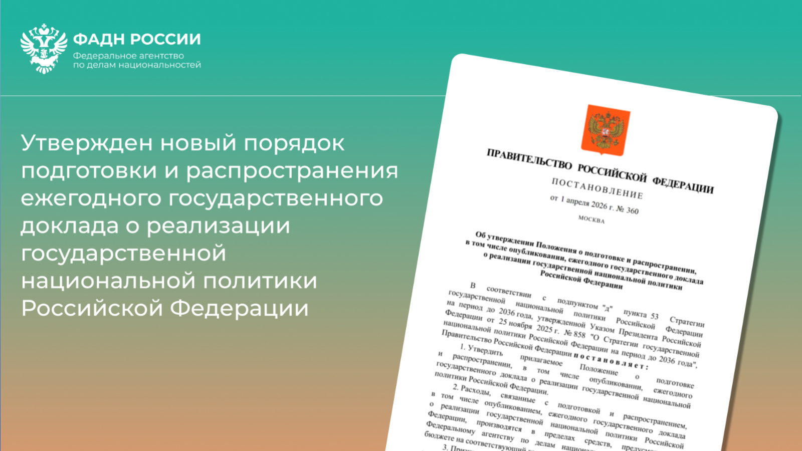 Правительство Российской Федерации постановлением от 1 апреля 2026 г. № 360 утвердило Положение о подготовке и распространении, в том числе опубликовании, ежегодного государственного доклада о реализации государственной национальной политики Российской Федерации.