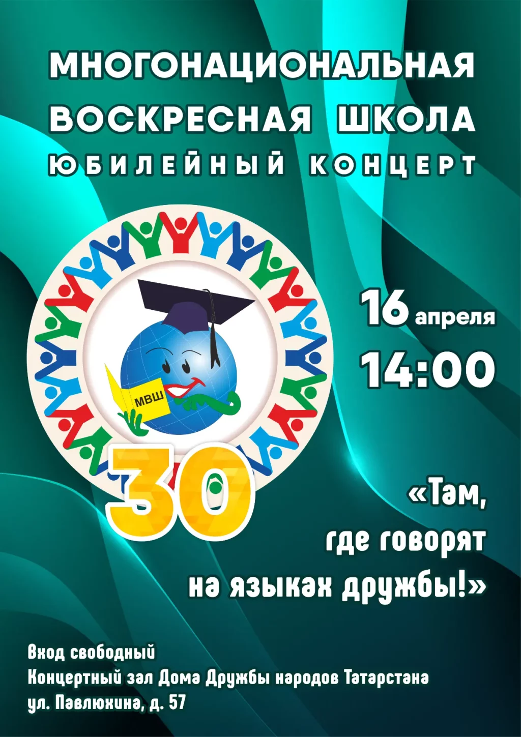 16 апреля 2026 года в концертном зале Дома Дружбы народов Татарстана состоится торжественное мероприятие в честь 30-летия Многонациональной воскресной школы г.Казани.