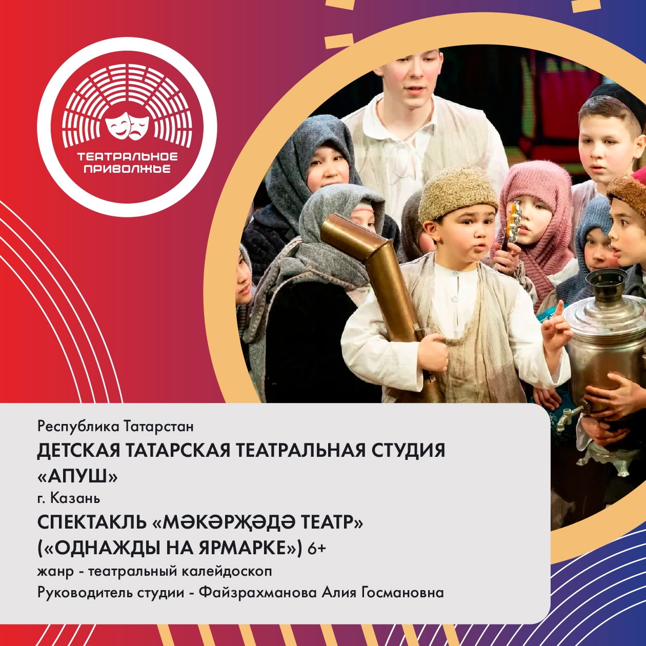 Детская татарская театральная студия «Апуш», представляющая Республику Татарстан в номинации «Детские театральные коллективы и студии» и занявшая I место, покажет победный спектакль «Мәкәрҗәдә театр» («Однажды на ярмарке») 21 апреля в Республиканском доме народного творчества (г. Ижевск).