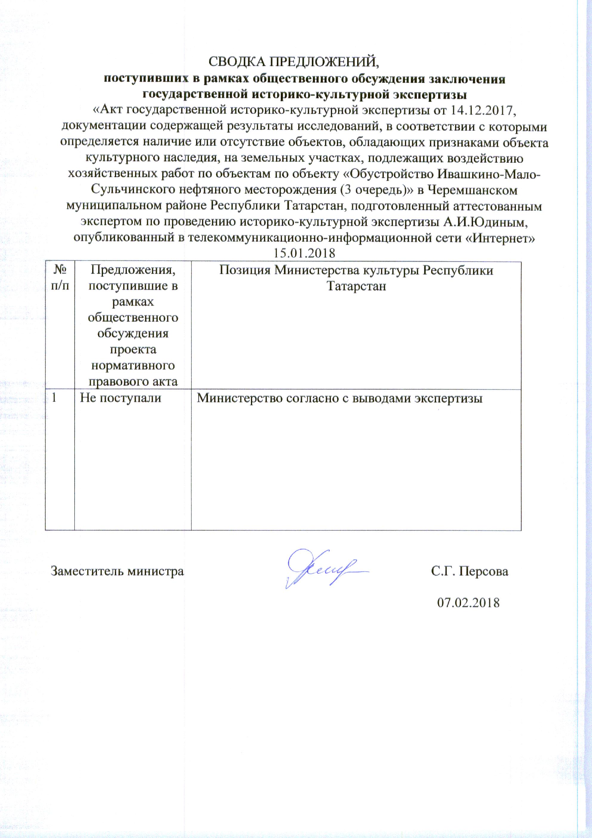 Акт государственной историко-культурной экспертизы документации, содержащей результаты и исследований, в соответствии с которыми определяется наличие или отсутствие объектов культурного наследия, включенных в реестр, выявленных объектов культурного наследия либо объектов, обладающих признаками объекта культурного наследия, на земельных участках .подлежащих воздействию земляных, строительных, мелиоративных, хозяйственных работ, работ по использованию лесов и иных работ по проекту «Обустройство Ивашкино-Мало-Сульчинского нефтяного месторождения (3 очередь)» в Черемшанском муниципальном районе Республики Татарстан.