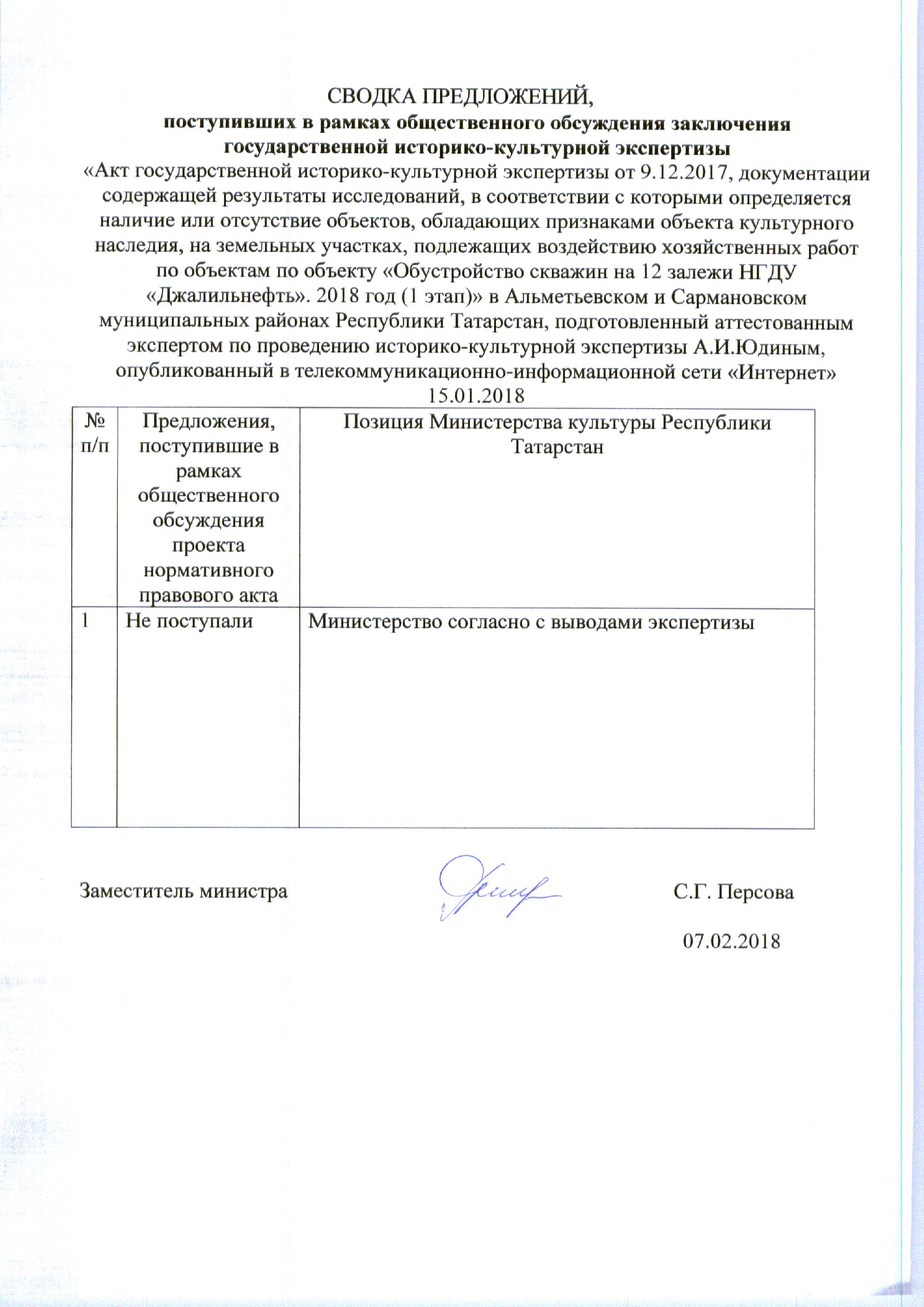 Акт государственной историко-культурной экспертизы документации, содержащей результаты и исследований, в соответствии с которыми определяется наличие или отсутствие объектов культурного наследия, включенных в реестр, выявленных объектов культурного наследия либо объектов, обладающих признаками объекта культурного наследия, на земельных участках .подлежащих воздействию земляных, строительных, мелиоративных, хозяйственных работ, работ по использованию лесов и иных работ по проекту «Обустройство скважин на 12 залежи НГДУ «Джалильнефть». 2018 год (1 этап)» в Альметьевском и Сармановском муниципальных районах Республики Татарстан.