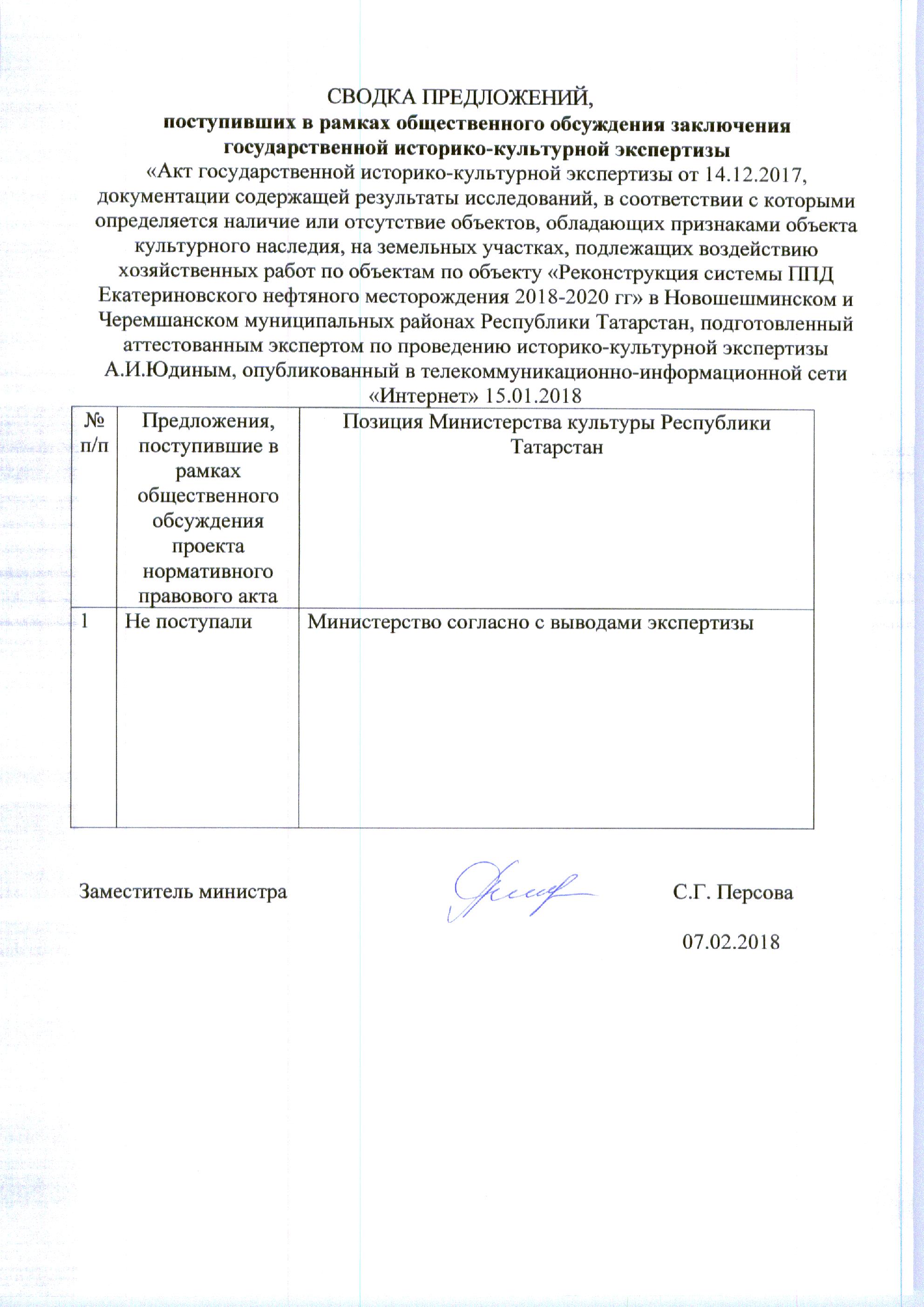 Акт государственной историко-культурной экспертизы документации, содержащей результаты и исследований, в соответствии с которыми определяется наличие или отсутствие объектов культурного наследия, включенных в реестр, выявленных объектов культурного наследия либо объектов, обладающих признаками объекта культурного наследия, на земельных участках .подлежащих воздействию земляных, строительных, мелиоративных, хозяйственных работ, работ по использованию лесов и иных работ по проекту «Реконструкция системы ППД Екатериновского нефтяного месторождения 2018-2020 гг» в Новошешминском и Черемшанском муниципальных районах Республики Татарстан.