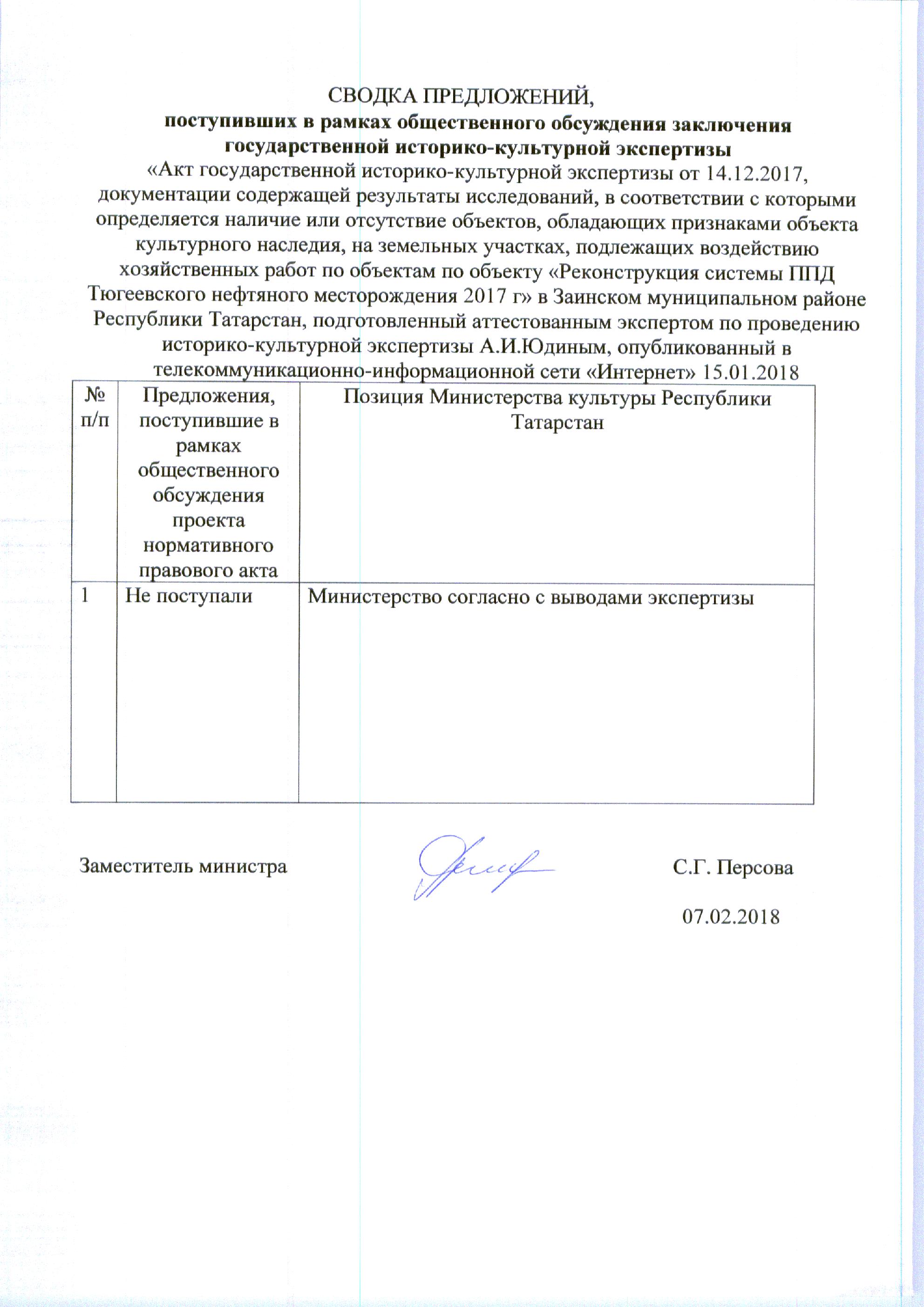 Акт государственной историко-культурной экспертизы документации, содержащей результаты и исследований, в соответствии с которыми определяется наличие или отсутствие объектов культурного наследия, включенных в реестр, выявленных объектов культурного наследия либо объектов, обладающих признаками объекта культурного наследия, на земельных участках .подлежащих воздействию земляных, строительных, мелиоративных, хозяйственных работ, работ по использованию лесов и иных работ по проекту «Реконструкция системы ППД Тюгеевского нефтяного месторождения 2017 г» в Заинском муниципальном районе Республики Татарстан.