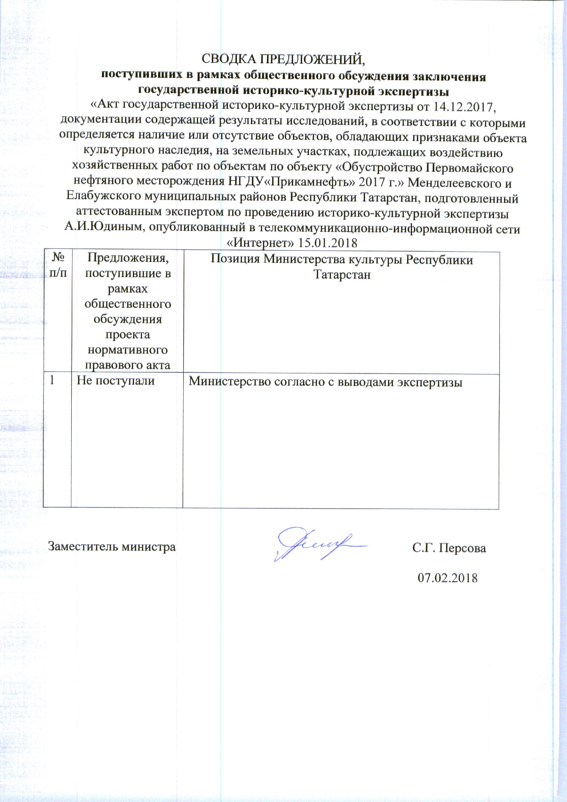 Акт государственной историко-культурной экспертизы документации, содержащей результаты и исследований, в соответствии с которыми определяется наличие или отсутствие объектов культурного наследия, включенных в реестр, выявленных объектов культурного наследия либо объектов, обладающих признаками объекта культурного наследия, на земельных участках .подлежащих воздействию земляных, строительных, мелиоративных, хозяйственных работ, работ по использованию лесов и иных работ по проекту «Обустройство Первомайского нефтяного месторождения НГДУ «Прикамнефть» 2017 г.» Менделеевского и Елабужского муниципальных районов Республики Татарстан