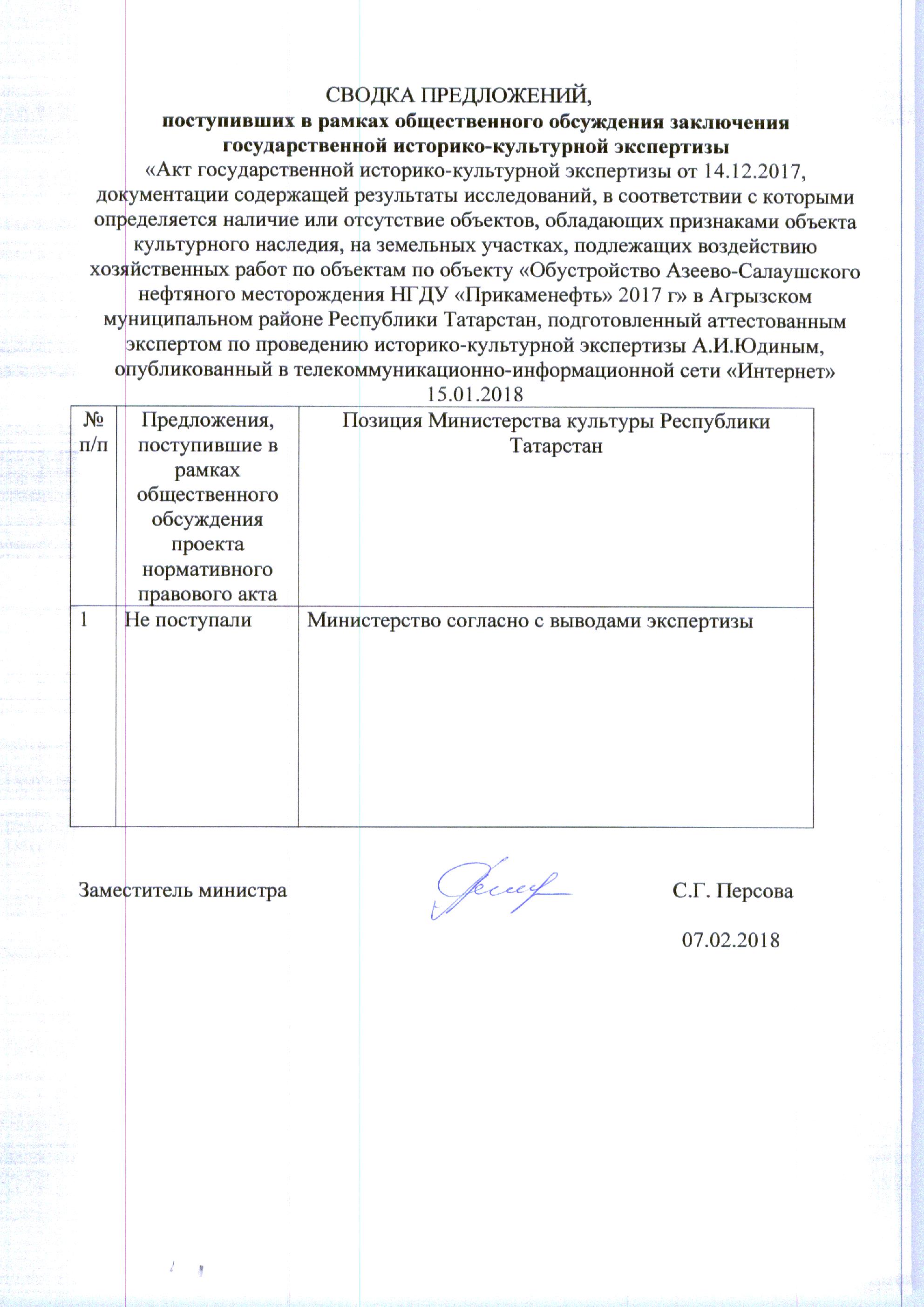 Акт государственной историко-культурной экспертизы документации, содержащей результаты и исследований, в соответствии с которыми определяется наличие или отсутствие объектов культурного наследия, включенных в реестр, выявленных объектов культурного наследия либо объектов, обладающих признаками объекта культурного наследия, на земельных участках .подлежащих воздействию земляных, строительных, мелиоративных, хозяйственных работ, работ по использованию лесов и иных работ по проекту «Обустройство Азеево-Салаушского нефтяного месторождения НГДУ «Прикаменефть» 2017 г» в Агрызском муниципальном районе Республики Татарстан