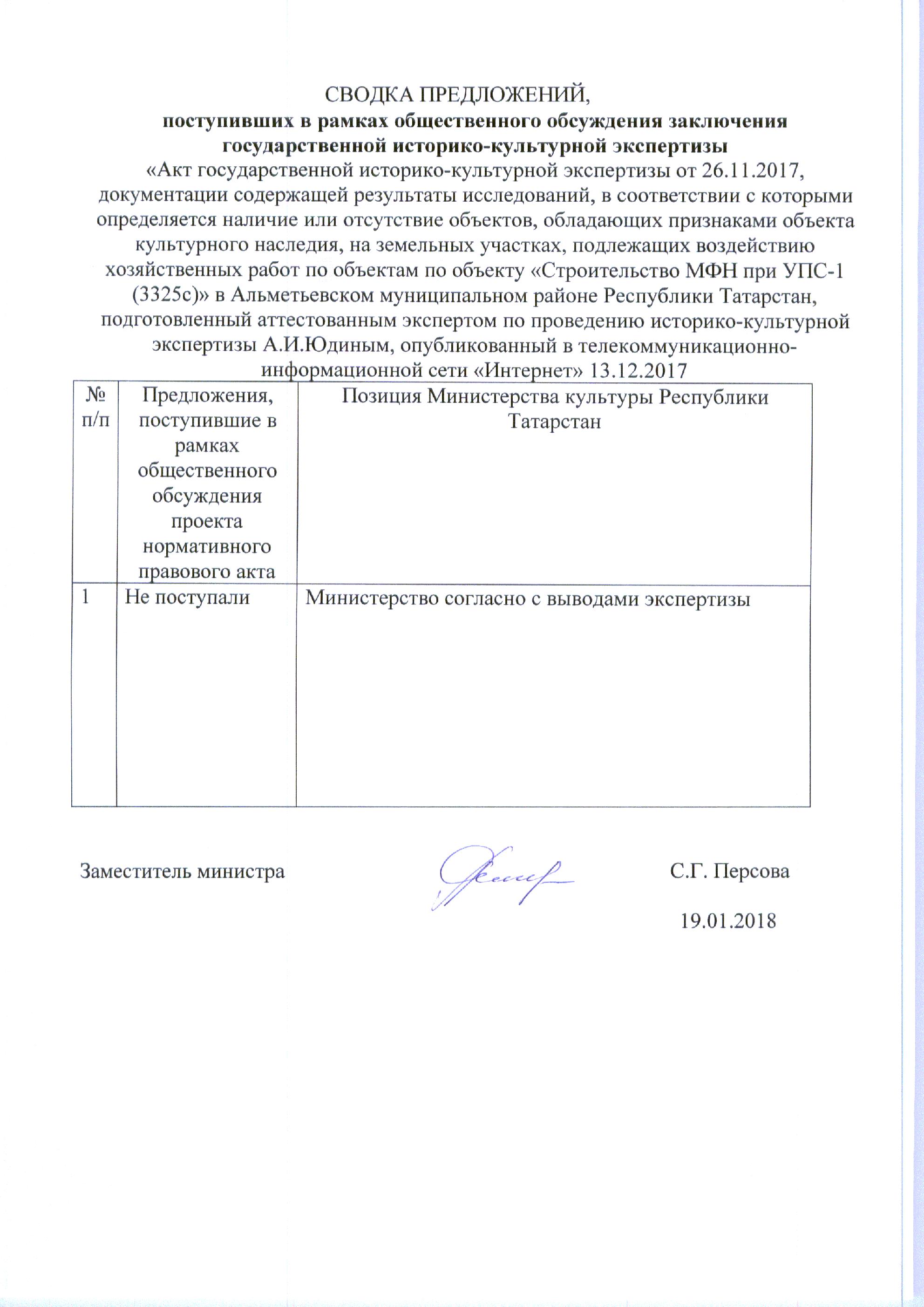 Акт государственной историко-культурной экспертизы документации, содержащей результаты и исследований, в соответствии с которыми определяется наличие или отсутствие объектов культурного наследия, включенных в реестр, выявленных объектов культурного наследия либо объектов, обладающих признаками объекта культурного наследия, на земельных участках .подлежащих воздействию земляных, строительных, мелиоративных, хозяйственных работ, работ по использованию лесов и иных работ по проекту «Строительство МФН при УПС-1 (3325с)» в Альметьевском муниципальном районе Республики Татарстан.