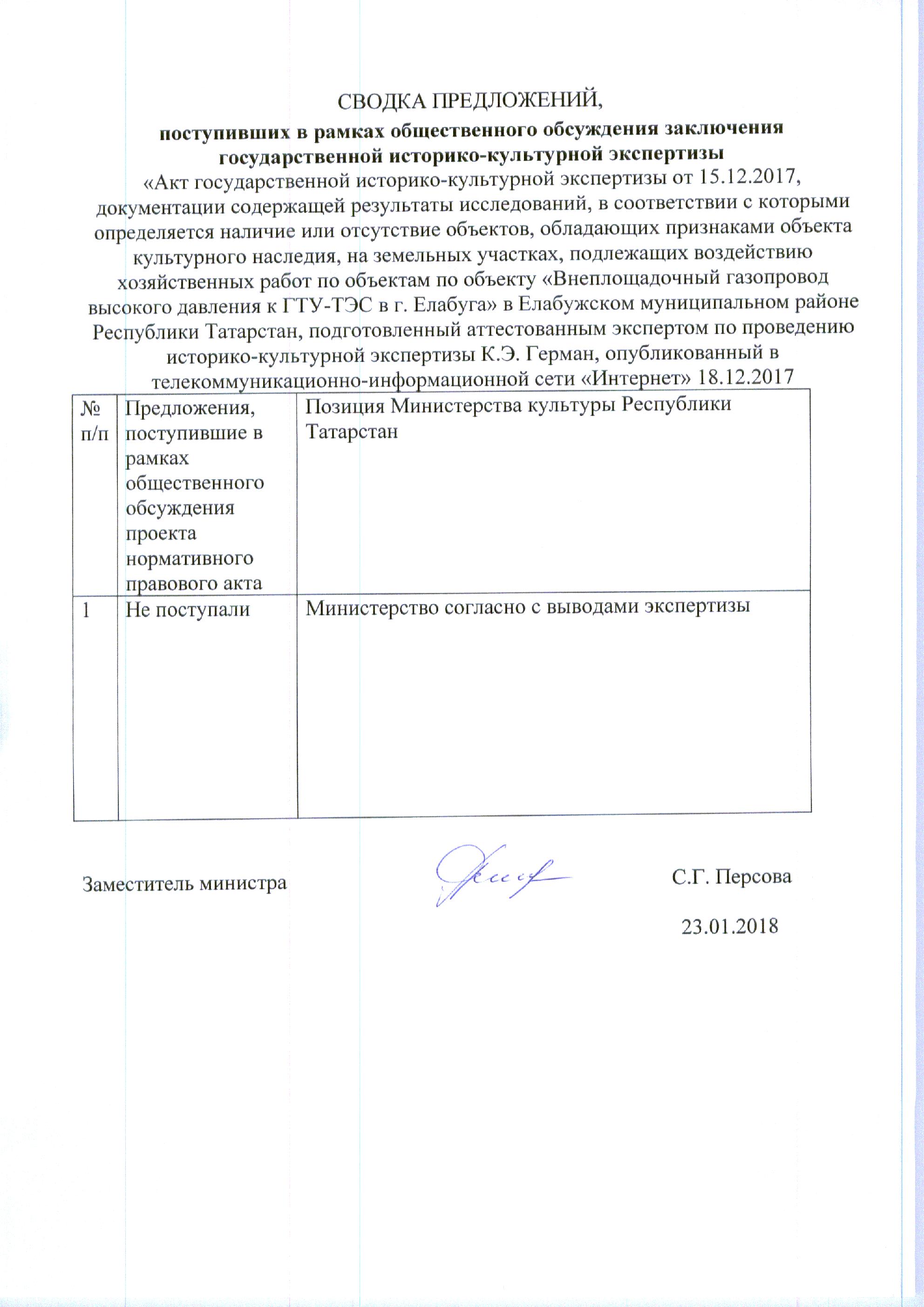 Акт государственной историко-культурной экспертизы документации, содержащей результаты и исследований, в соответствии с которыми определяется наличие или отсутствие объектов культурного наследия, включенных в реестр, выявленных объектов культурного наследия либо объектов, обладающих признаками объекта культурного наследия, на земельных участках .подлежащих воздействию земляных, строительных, мелиоративных, хозяйственных работ, работ по использованию лесов и иных работ по проекту «Внеплощадочный газопровод высокого давления к ГТУ-ТЭС в г. Елабуга»