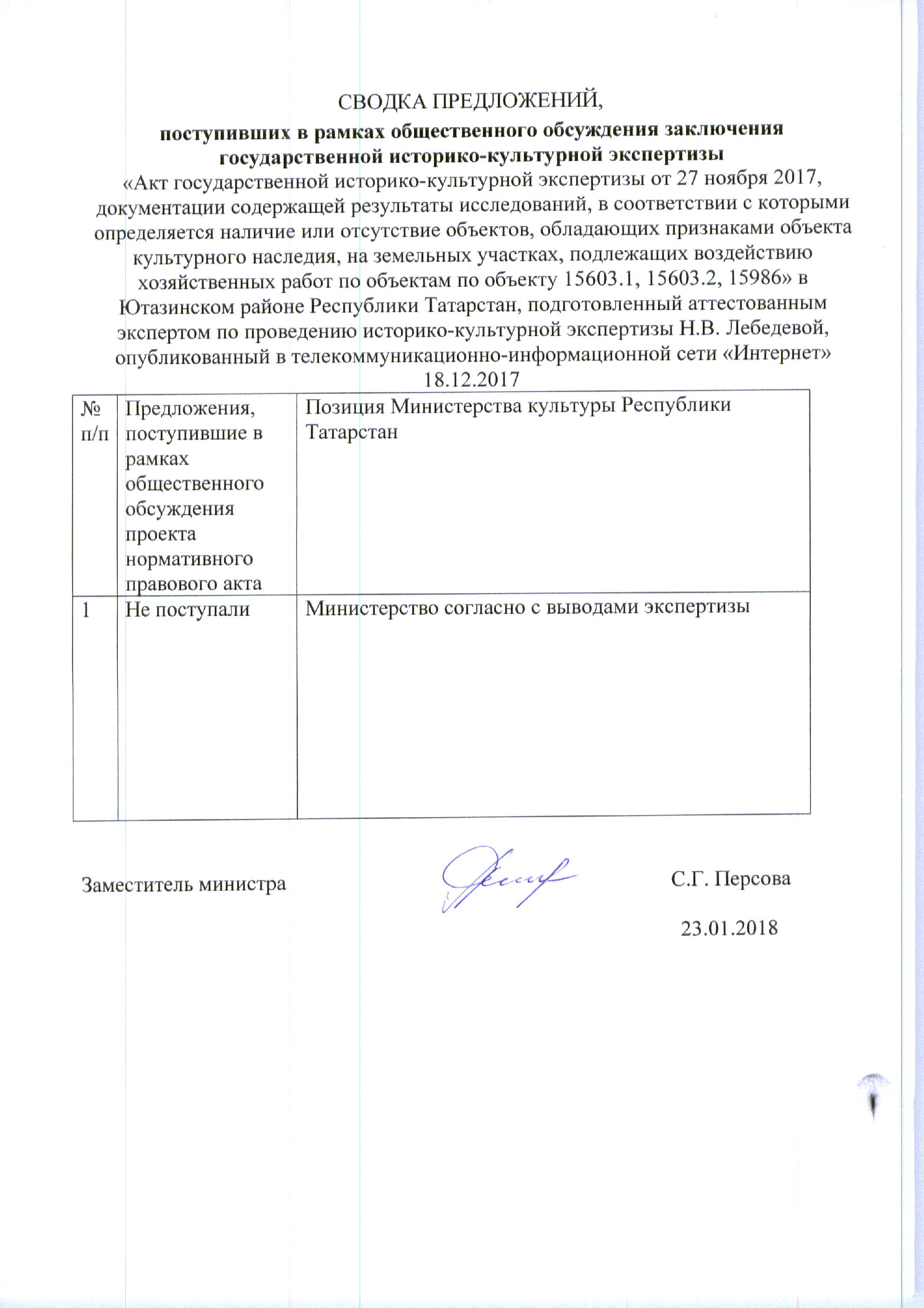 Акт государственной историко-культурной экспертизы документации, содержащей результаты и исследований, в соответствии с которыми определяется наличие или отсутствие объектов культурного наследия, включенных в реестр, выявленных объектов культурного наследия либо объектов, обладающих признаками объекта культурного наследия, на земельных участках .подлежащих воздействию земляных, строительных, мелиоративных, хозяйственных работ, работ по использованию лесов и иных работ по проекту "ООО «БашНИПИнефть»: 15603.1, 15603.2, 15986 в Ютазинском районе Республики Татарстан