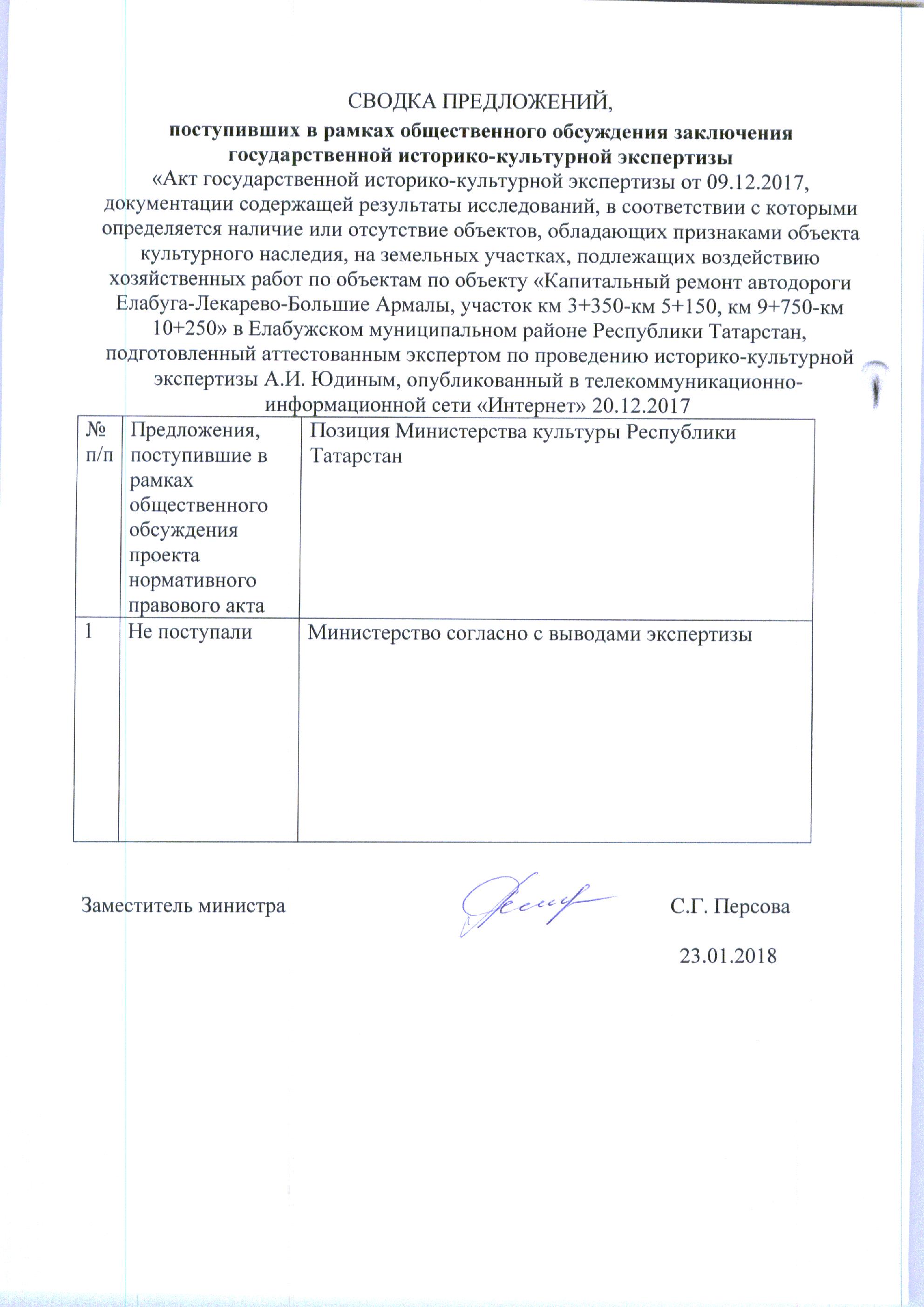 Акт государственной историко-культурной экспертизы документации, содержащей результаты и исследований, в соответствии с которыми определяется наличие или отсутствие объектов культурного наследия, включенных в реестр, выявленных объектов культурного наследия либо объектов, обладающих признаками объекта культурного наследия, на земельных участках .подлежащих воздействию земляных, строительных, мелиоративных, хозяйственных работ, работ по использованию лесов и иных работ по проекту «Капитальный ремонт автодороги Елабуга-Лекарево-Большие Армалы, участок км 3+350-км 5+150, км 9+750-км 10+250 в Елабужском муниципальном районе Республики Татарстан» в Елабужском муниципальном районе Республики Татарстан.