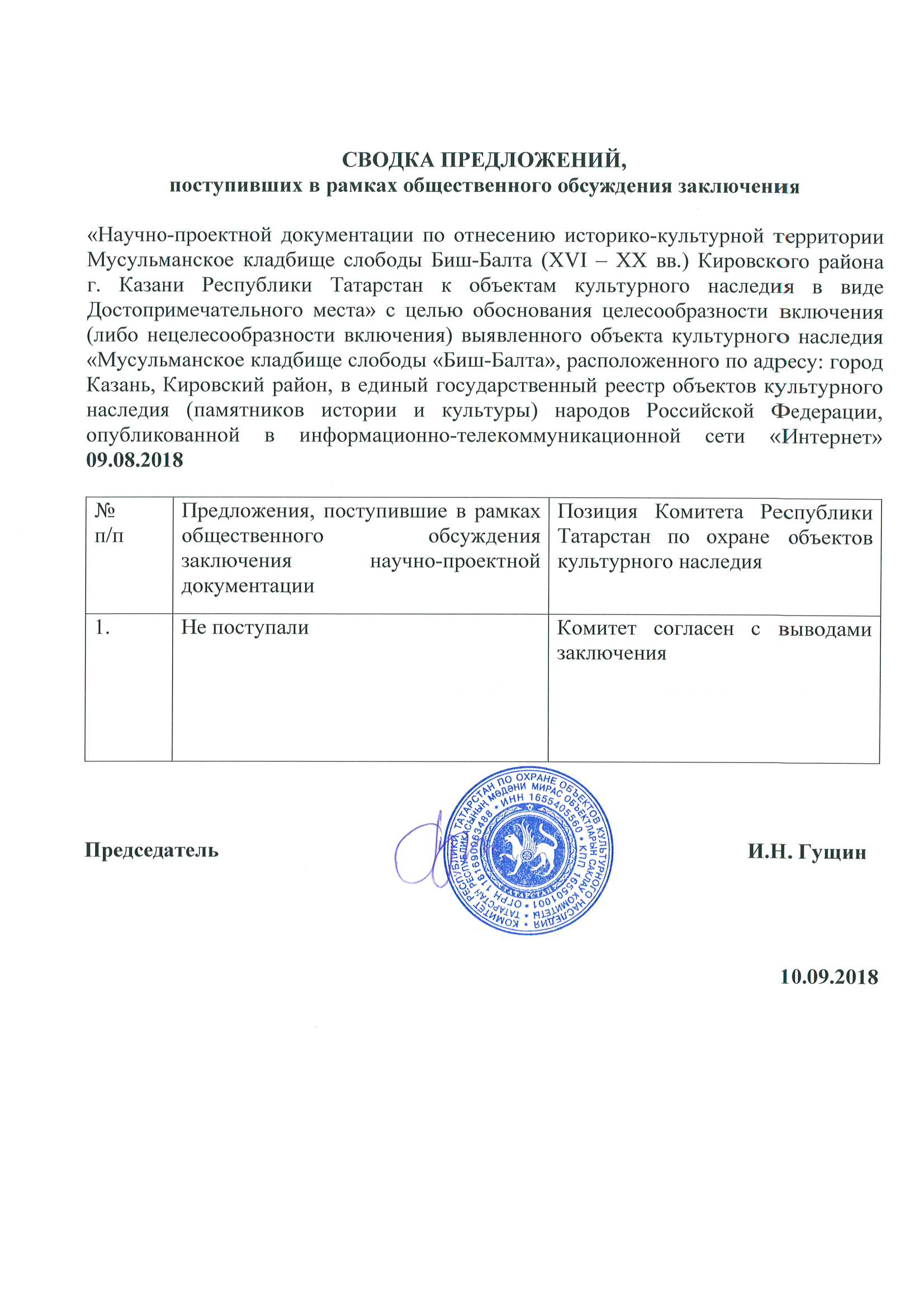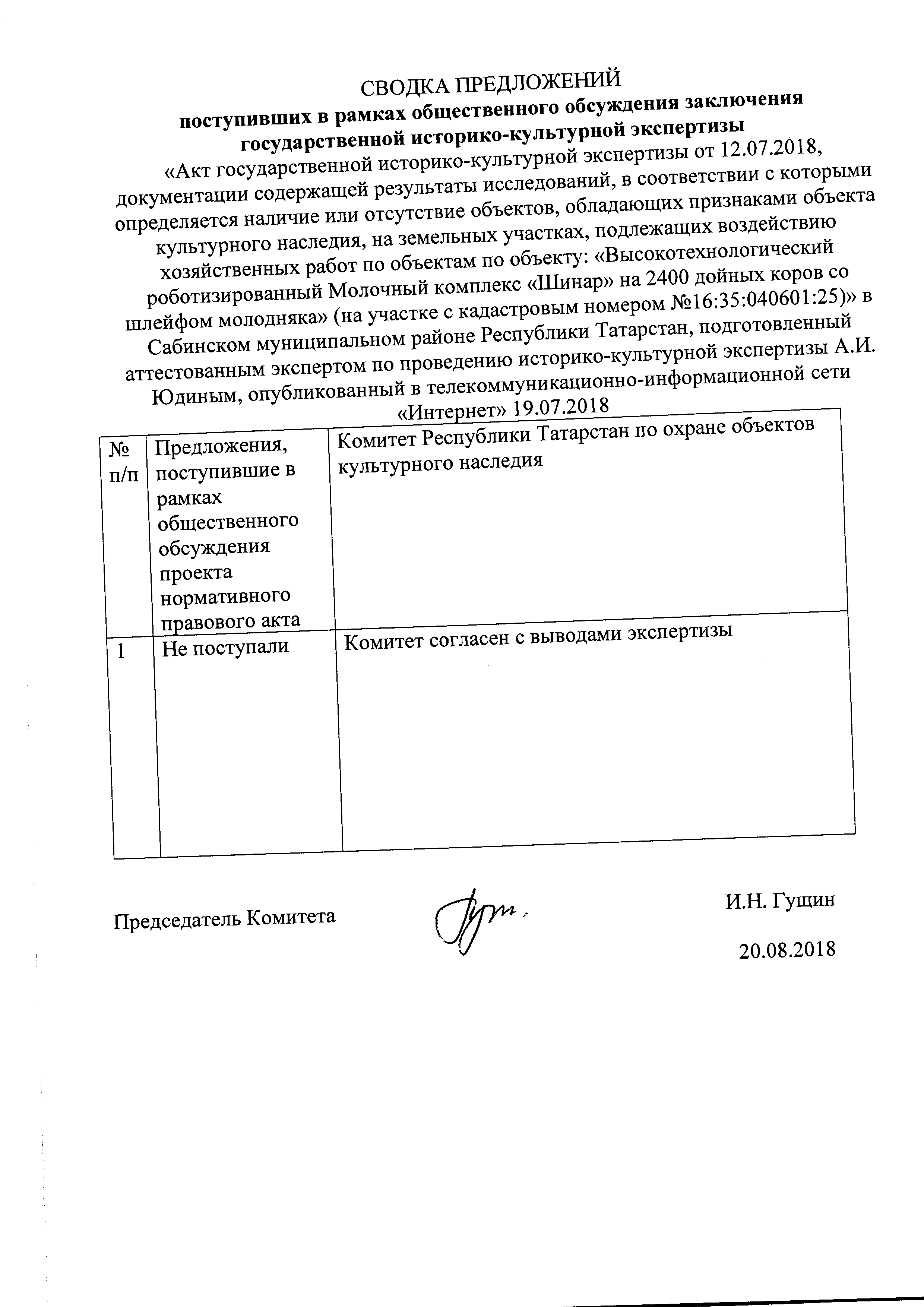 Акт государственной историко-культурной экспертизы документации, содержащей результаты и исследований, в соответствии с которыми определяется наличие или отсутствие объектов культурного наследия, включенных в реестр, выявленных объектов культурного наследия либо объектов, обладающих признаками объекта культурного наследия, на земельных участках .подлежащих воздействию земляных, строительных, мелиоративных, хозяйственных работ, работ по использованию лесов и иных работ по проекту «Животноводческая ферма на 1000 голов дойного стада в с.Чишма Актанышского района РТ» в Актанышском муниципальном районе Республики Татарстан.