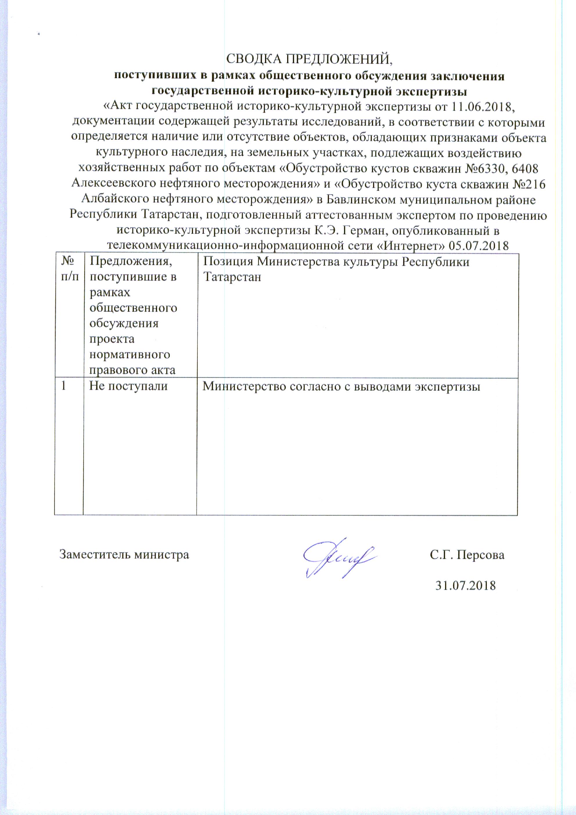 Акт государственной историко-культурной экспертизы документации, содержащей результаты и исследований, в соответствии с которыми определяется наличие или отсутствие объектов культурного наследия, включенных в реестр, выявленных объектов культурного наследия либо объектов, обладающих признаками объекта культурного наследия, на земельных участках .подлежащих воздействию земляных, строительных, мелиоративных, хозяйственных работ, работ по использованию лесов и иных работ по проекту «Обустройство кустов скважин №6330, 6408 Алексеевского нефтяного месторождения» и «Обустройство куста скважин №216 Албайского нефтяного месторождения» в Бавлинском муниципальном районе Республики Татарстан и в Северном районе Оренбургской области