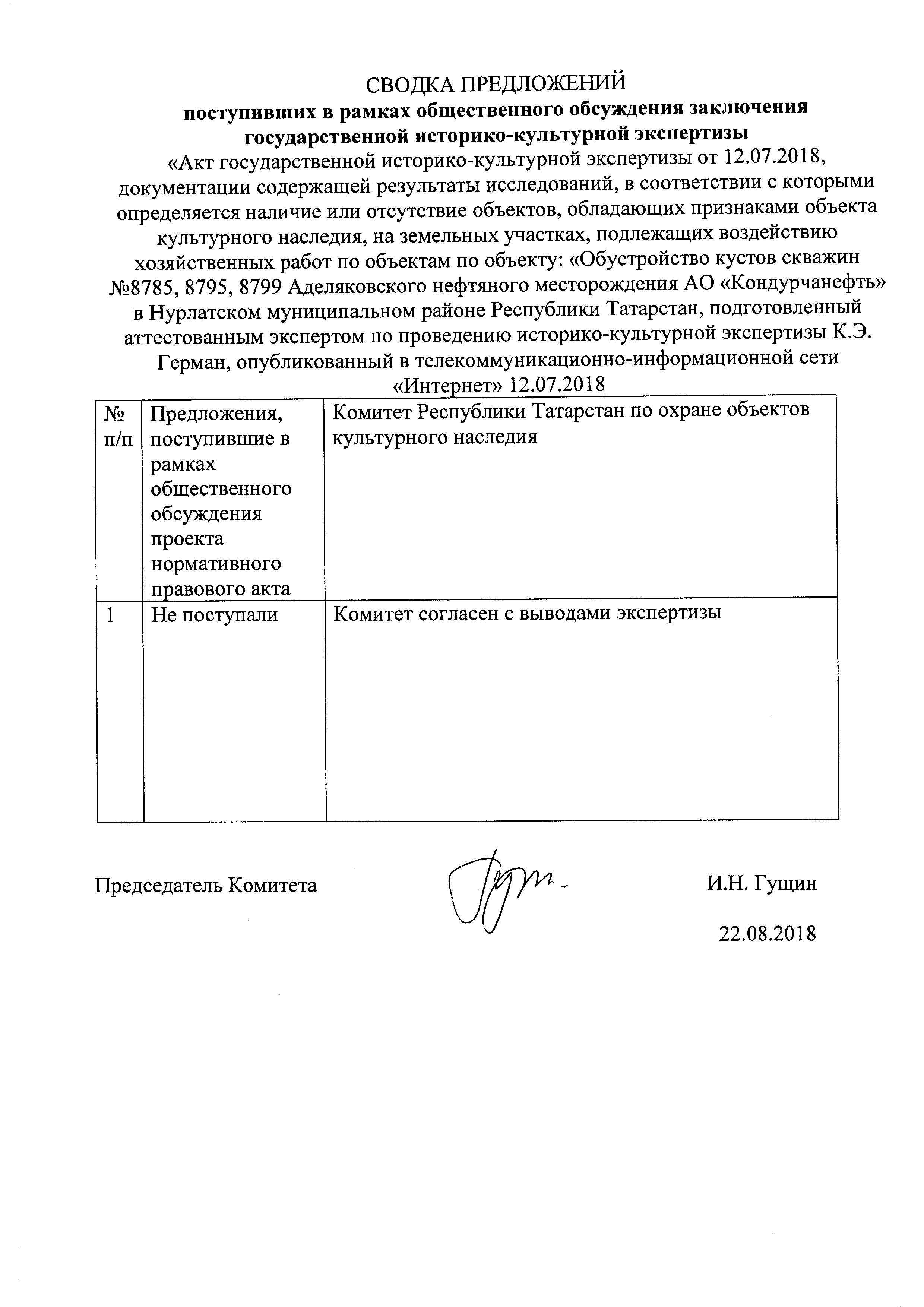 Акт государственной историко-культурной экспертизы документации, содержащей результаты и исследований, в соответствии с которыми определяется наличие или отсутствие объектов культурного наследия, включенных в реестр, выявленных объектов культурного наследия либо объектов, обладающих признаками объекта культурного наследия, на земельных участках .подлежащих воздействию земляных, строительных, мелиоративных, хозяйственных работ, работ по использованию лесов и иных работ по проекту «Обустройство кустов скважин №8785, 8795, 8799 Аделяковского нефтяного месторождения АО «Кондурчанефть» в Нурлатском муниципальном районе Республики Татарстан