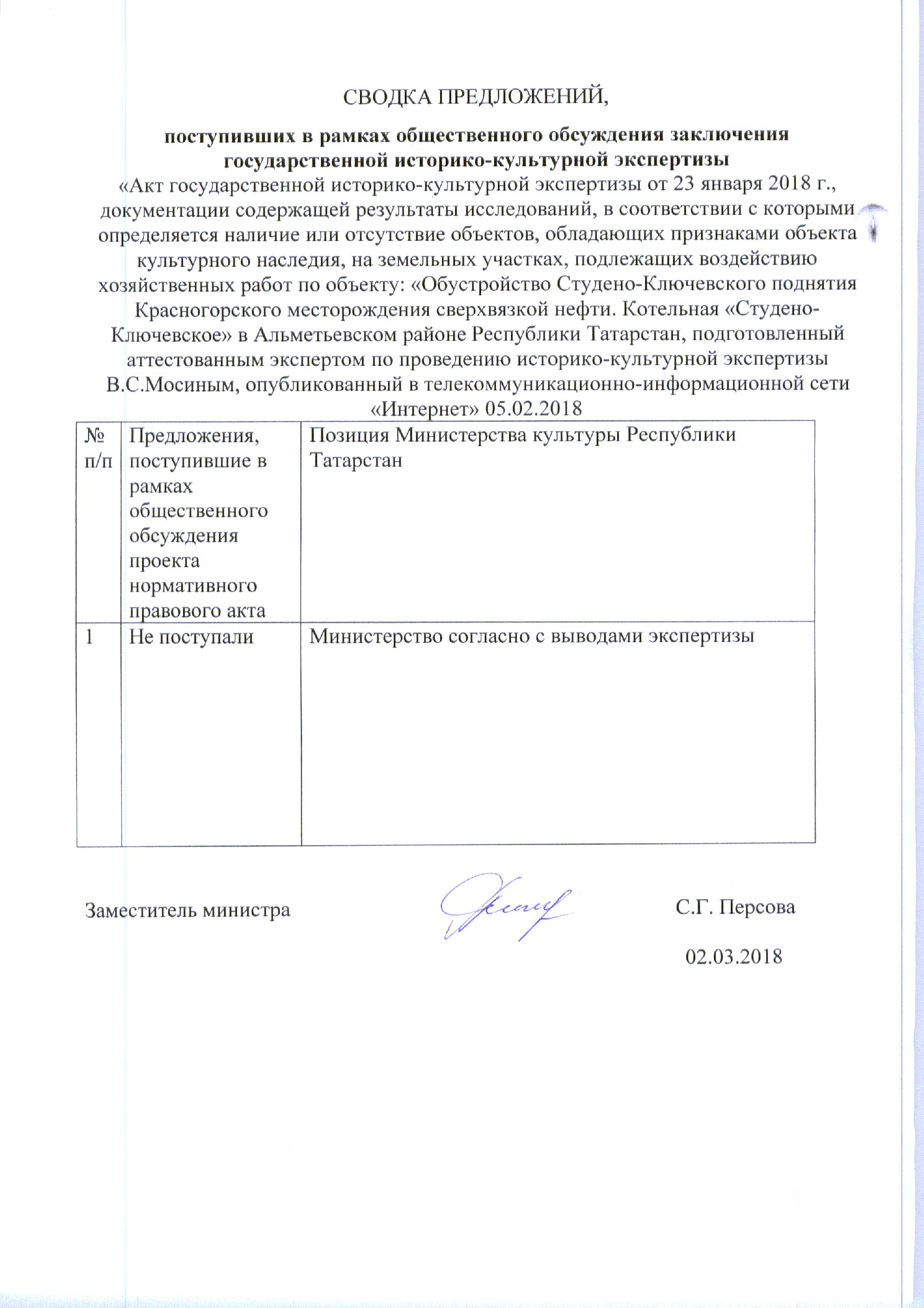 Акт государственной историко-культурной экспертизы документации, содержащей результаты и исследований, в соответствии с которыми определяется наличие или отсутствие объектов культурного наследия, включенных в реестр, выявленных объектов культурного наследия либо объектов, обладающих признаками объекта культурного наследия, на земельных участках .подлежащих воздействию земляных, строительных, мелиоративных, хозяйственных работ, работ по использованию лесов и иных работ по проекту «Обустройство Студено-Ключевского поднятия Красногорского месторождения сверхвязкой нефти. Котельная «Студено-Ключевское». в Альметьевском районе Республики Татарстан