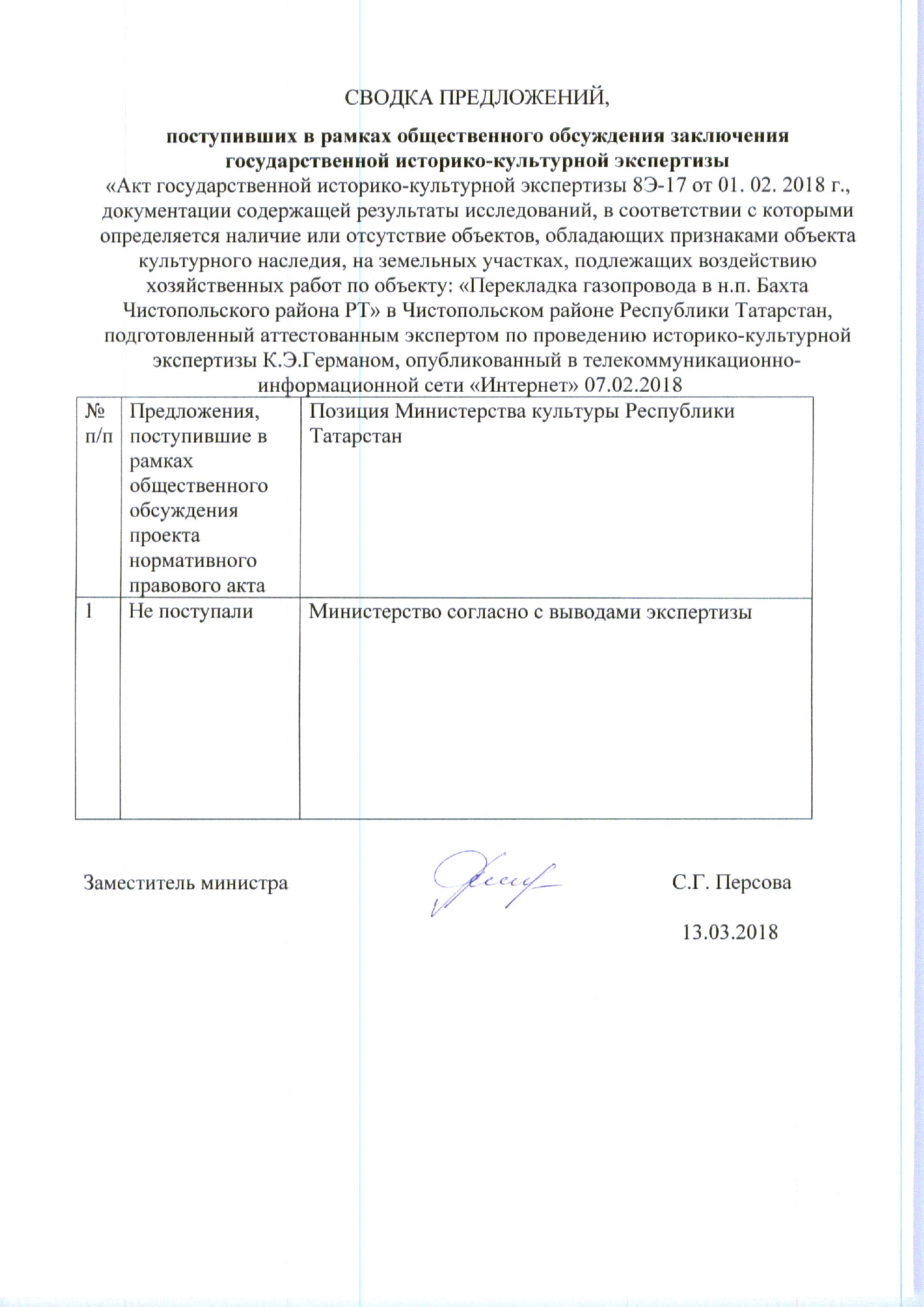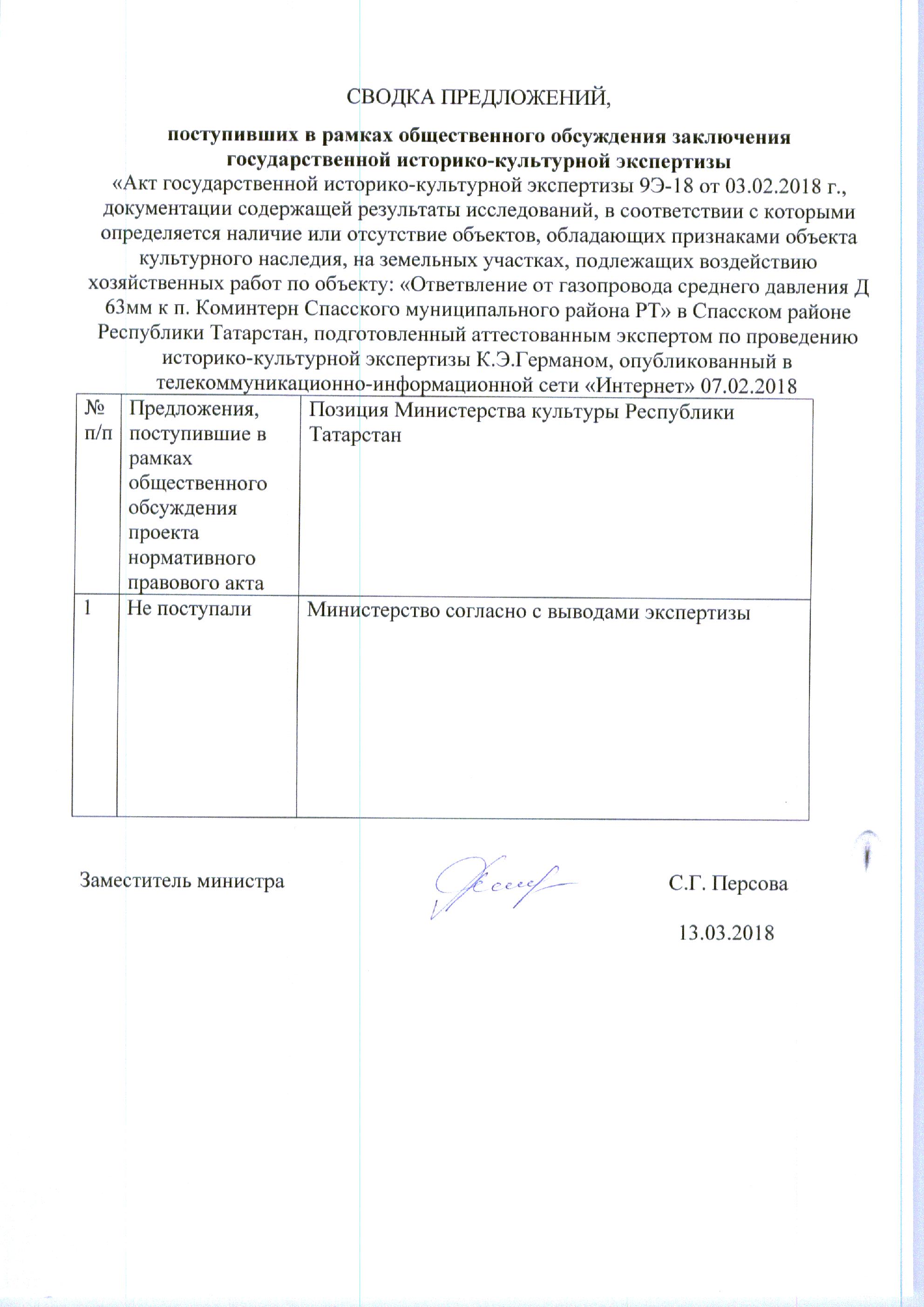 Акт государственной историко-культурной экспертизы документации, содержащей результаты и исследований, в соответствии с которыми определяется наличие или отсутствие объектов культурного наследия, включенных в реестр, выявленных объектов культурного наследия либо объектов, обладающих признаками объекта культурного наследия, на земельных участках .подлежащих воздействию земляных, строительных, мелиоративных, хозяйственных работ, работ по использованию лесов и иных работ по проекту «Ответвление от газопровода среднего давления Д 63мм к п. Коминтерн Спасского муниципального района РТ»
