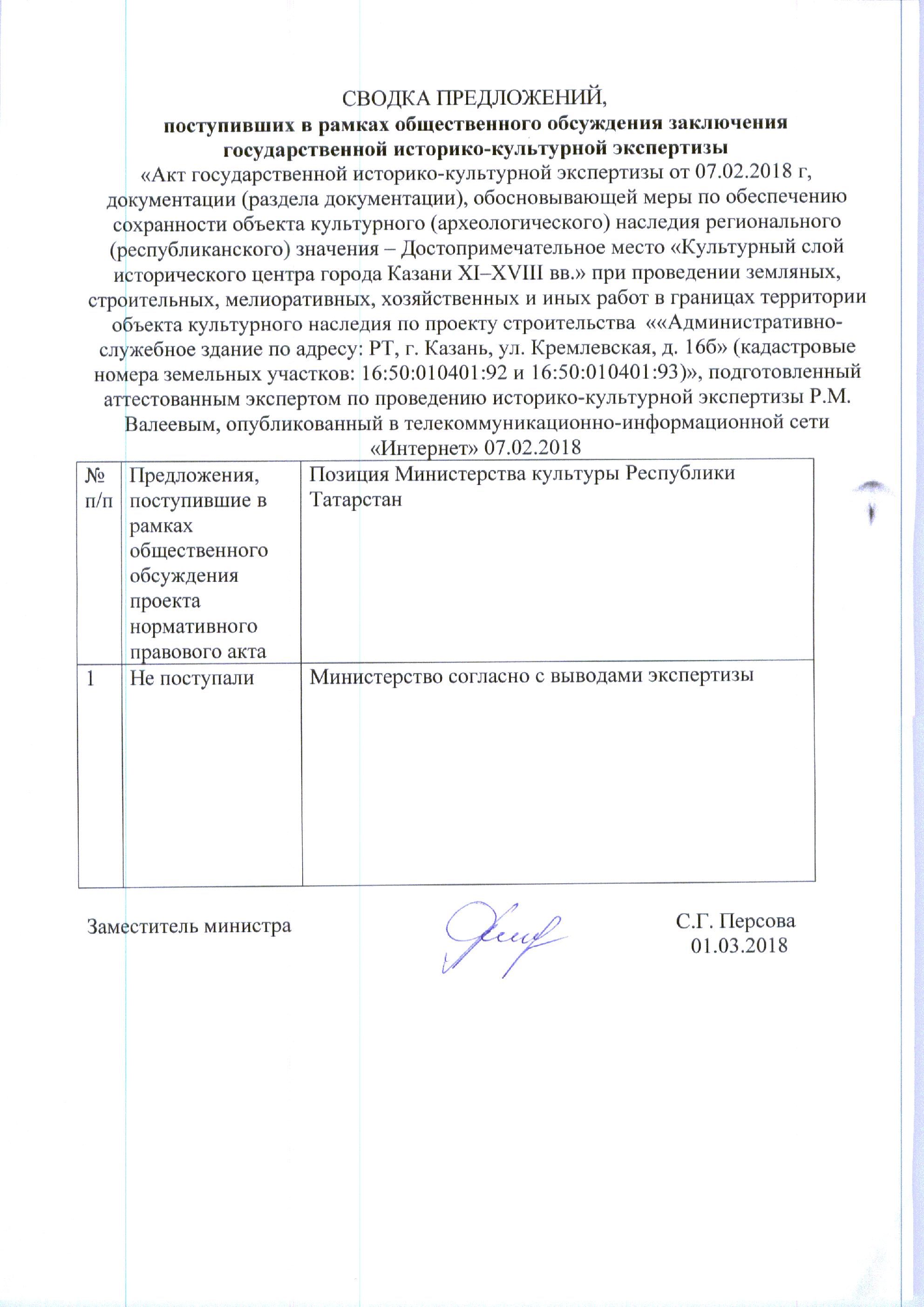 Акт государственной историко-культурной экспертизы документации, обосновывающей меры по обеспечению сохранности объекта культурного (археологического) наследия регионального (республиканского) значения – Достопримечательное место «Культурный слой исторического центра города Казани XI-XVIII вв.» при проведении земляных, строительных, мелиоративных, хозяйственных и иных работ по проекту строительства «Административно-служебное здание по адресу: РТ, г. Казань, ул. Кремлевская, д. 16б» (кадастровые номера земельных участков: 16:50:010401:92 и 16:50:010401:93).