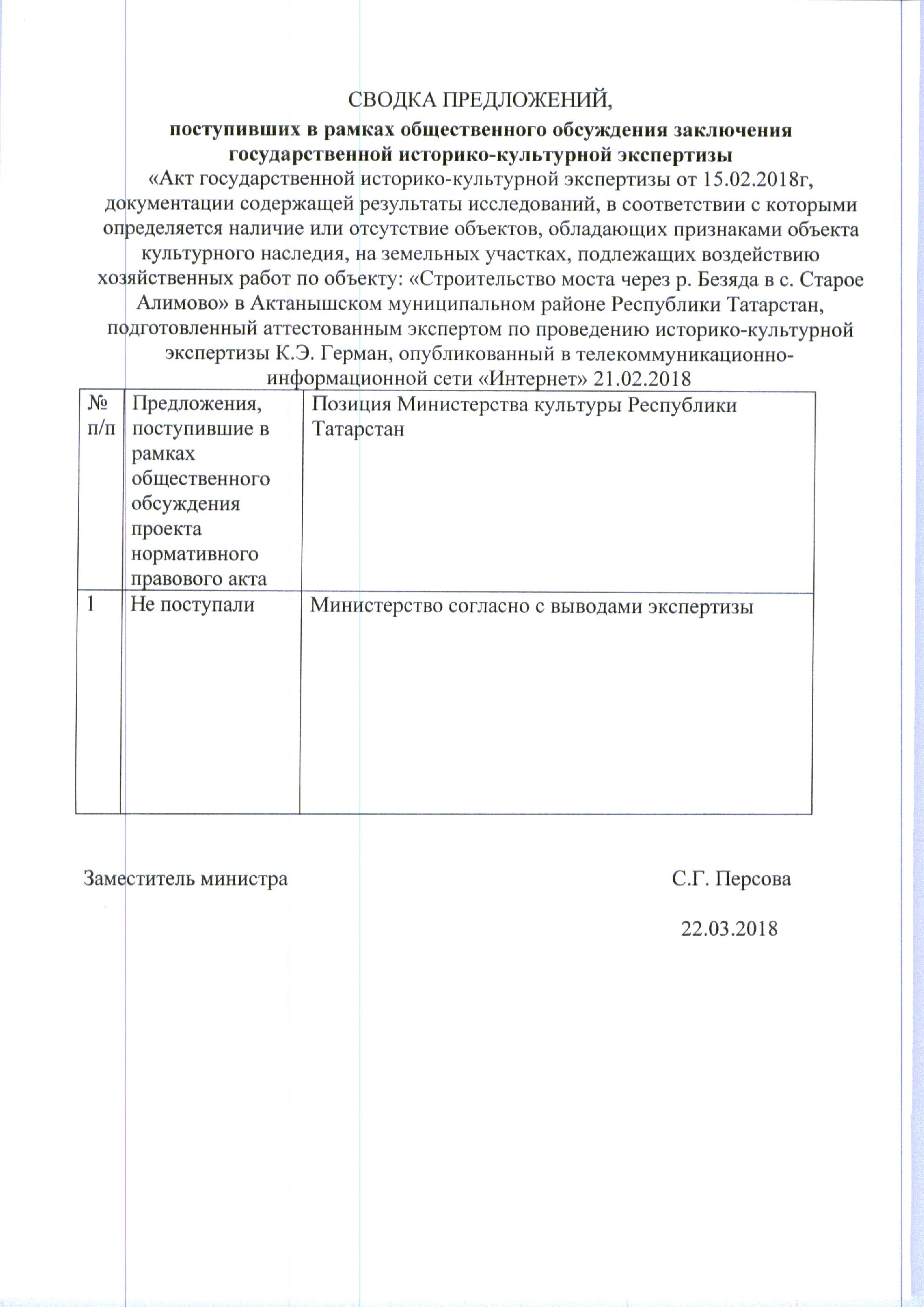 Акт государственной историко-культурной экспертизы документации, содержащей результаты и исследований, в соответствии с которыми определяется наличие или отсутствие объектов культурного наследия, включенных в реестр, выявленных объектов культурного наследия либо объектов, обладающих признаками объекта культурного наследия, на земельных участках .подлежащих воздействию земляных, строительных, мелиоративных, хозяйственных работ, работ по использованию лесов и иных работ по проекту «Строительство моста через р. Безяда в с. Старое Алимово» в Актанышском муниципальном районе Республики Татарстан