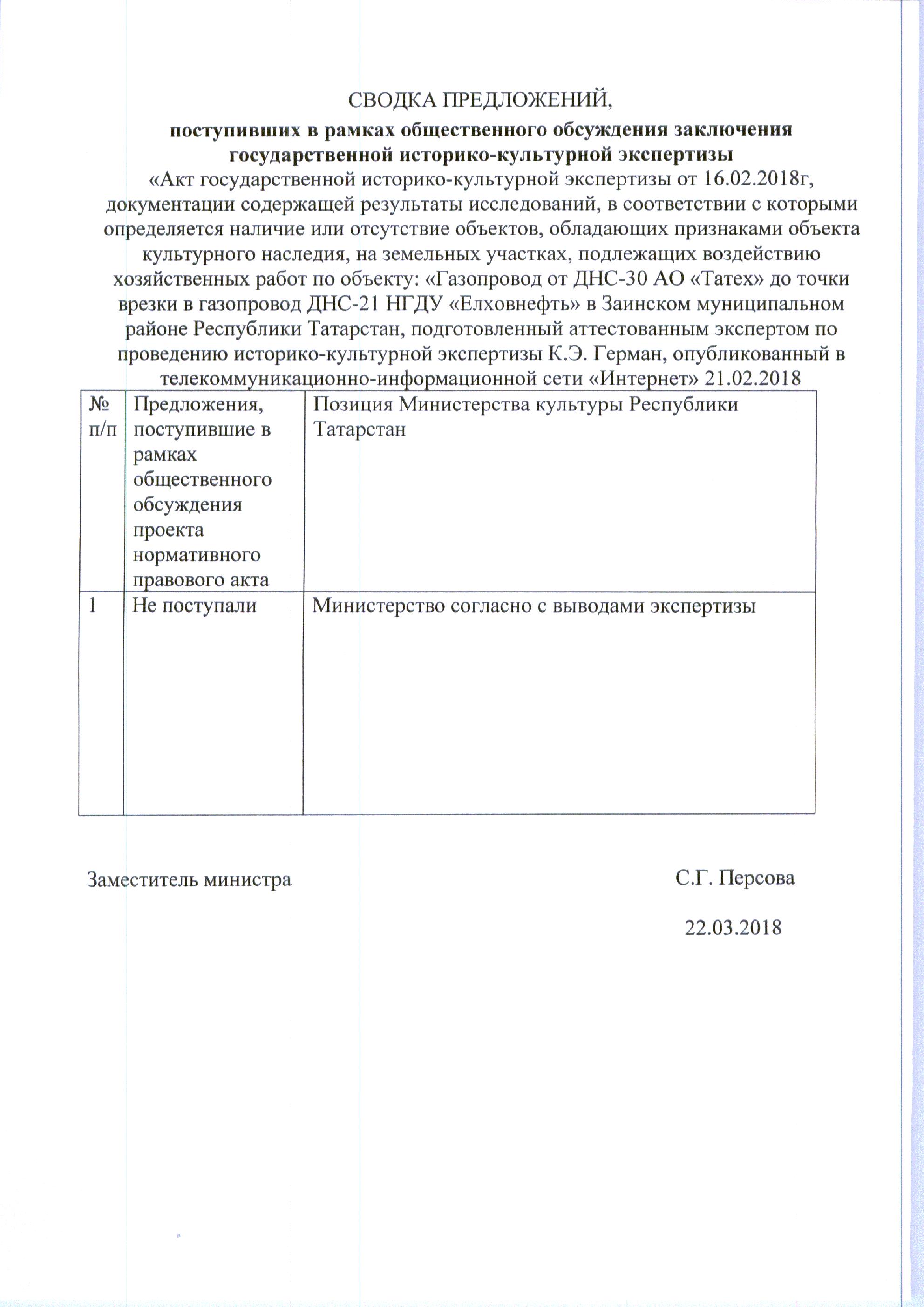 Акт государственной историко-культурной экспертизы документации, содержащей результаты и исследований, в соответствии с которыми определяется наличие или отсутствие объектов культурного наследия, включенных в реестр, выявленных объектов культурного наследия либо объектов, обладающих признаками объекта культурного наследия, на земельных участках .подлежащих воздействию земляных, строительных, мелиоративных, хозяйственных работ, работ по использованию лесов и иных работ по проекту «Газопровод от ДНС-30 АО «Татех» до точки врезки в газопровод ДНС-21 НГДУ «Елховнефть» в Заинском муниципальном районе Республики Татарстан
