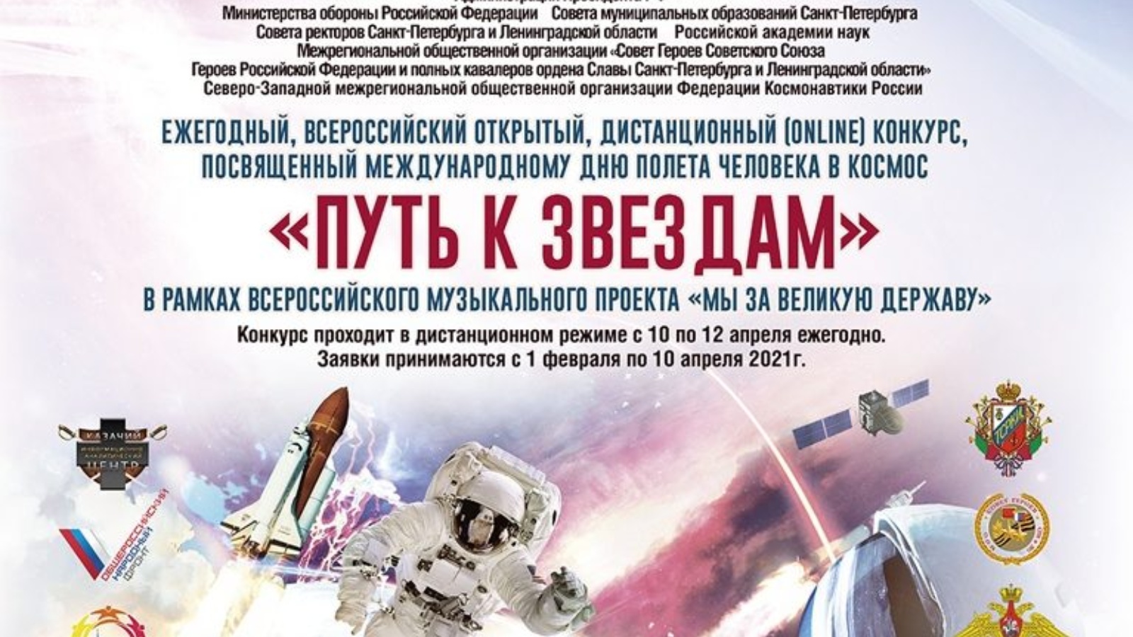 Агымдагы елның 10-12 апрелендә ел саен оештырыла торган Халыкара ачык дистанцион (online) конкурс узачак. «Йолдызларга юл!» конкурсы халыкара космоска очу көненә багышлана. «Без бөек держава өчен " Бөтенроссия музыкаль проекты кысаларында үткәрелә торган конкурс ел саен 12 апрельдә билгеләп үтелә.
