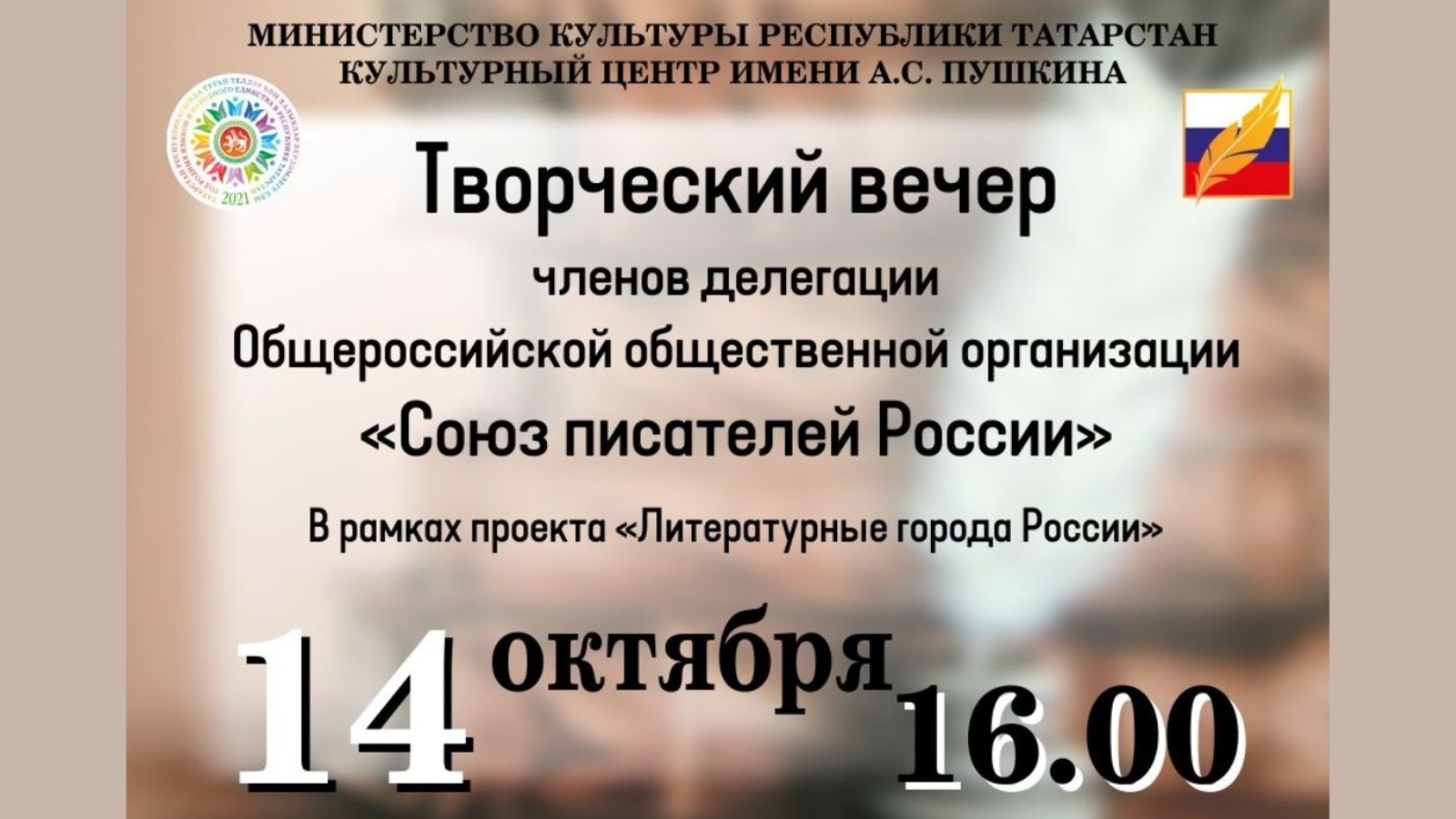 Делегация әгъзаларының иҗади кичәсе 14 октябрь 16.00 сәгатьтә А.С.Пушкин исемендәге мәдәният үзәгенең Зур залында (Карл Маркс ур.,26 йорт) узачак.