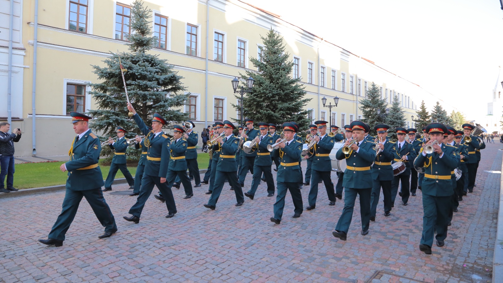 Марш атлау Спас манарасыннан башланды Шейнкман сукмагы буйлап училище оркестрының тантаналы музыкасы астында барачак. Казан Кремле белән тарихи бәйләнешне ассызыклап, марш атлауны тикшерү элеккеге Юнкер пехота училищесы бинасы каршында үтәчәк, Казан танк училищесы үзенең тарихын шушы бинадан башлаган.