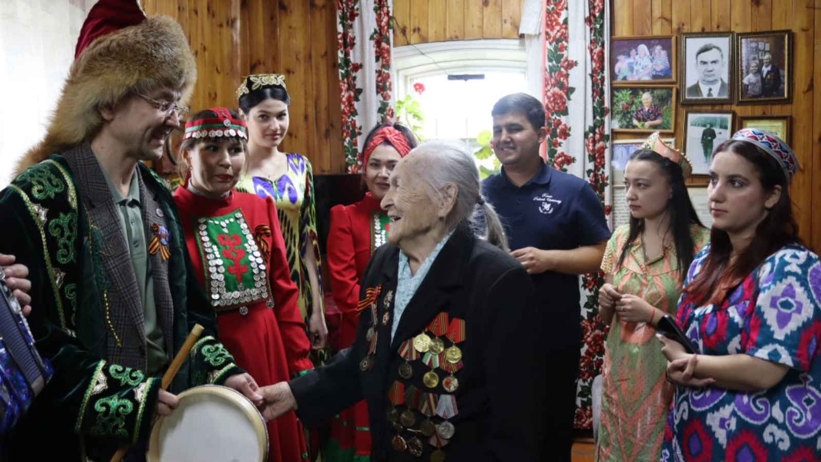 Бөек Ватан сугышы ветераны Әминә Гаязовна Әхмәдиева быел июль аенда 101 яшь тула. Татарстан халыклары дуслыгы йорты ярдәмендә аны Җиңүнең 80 еллыгы белән котларга таҗикларның милли-мәдәни автономиясе рәисе урынбасары Мирали Джонбеков һәм берләшмәнең яшьләр хәрәкәте активистлары килде. Акциягә ТР башкортлар НК рәисе урынбасары Тимур Йосыпов яшьләр белән бергә кушылды.